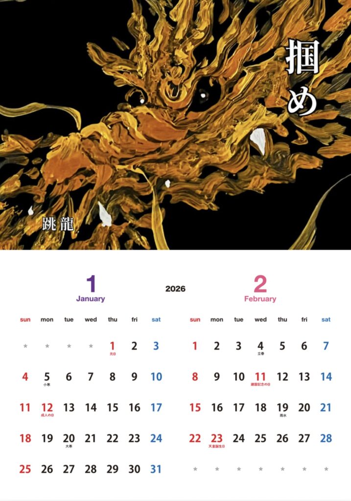 本暦は、 2026年1月〜2027年2月までの14ヶ月、 2ヶ月ごとに巡る龍画のカレンダーです。